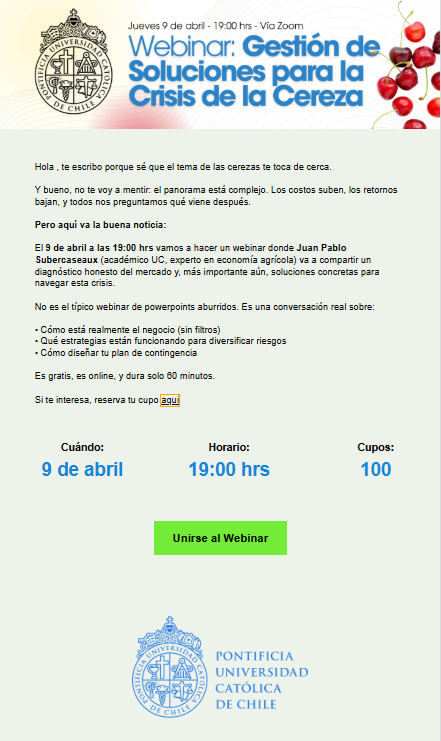 Se analizará el estado actual del mercado y se definirán los factores críticos a trabajar para lograr soluciones efectivas. Junto al diagnóstico del problema, se conversará sobre los caminos para enfrentarlos de manera eficiente y efectiva. Este webinar está dirigido a profesionales del agro, tomadores de decisiones en exportadoras y productores que buscan proteger la rentabilidad de su negocio.